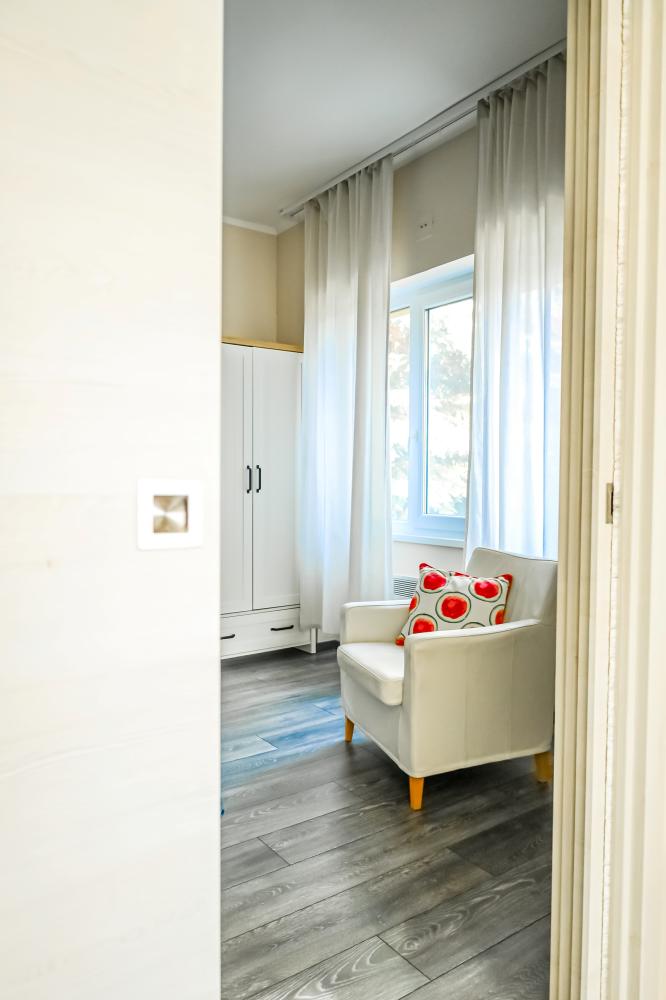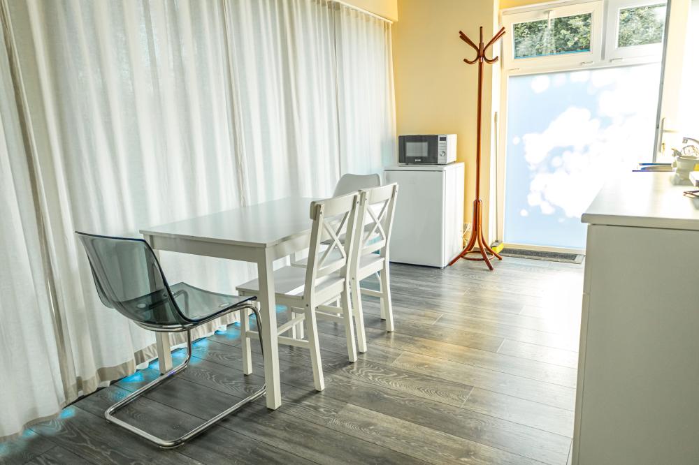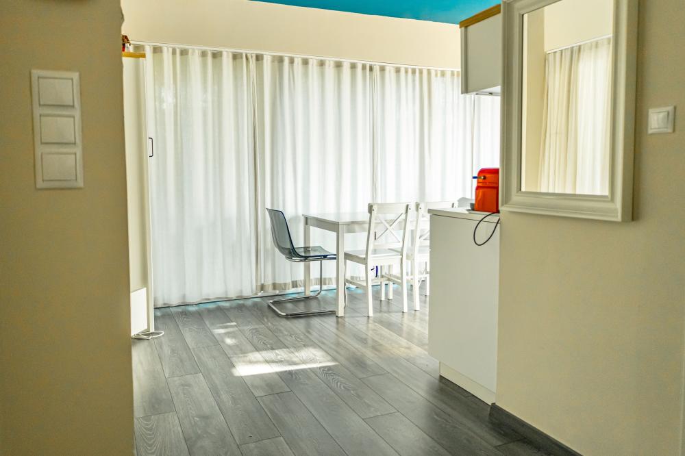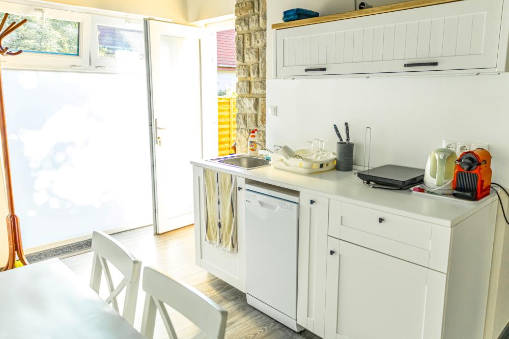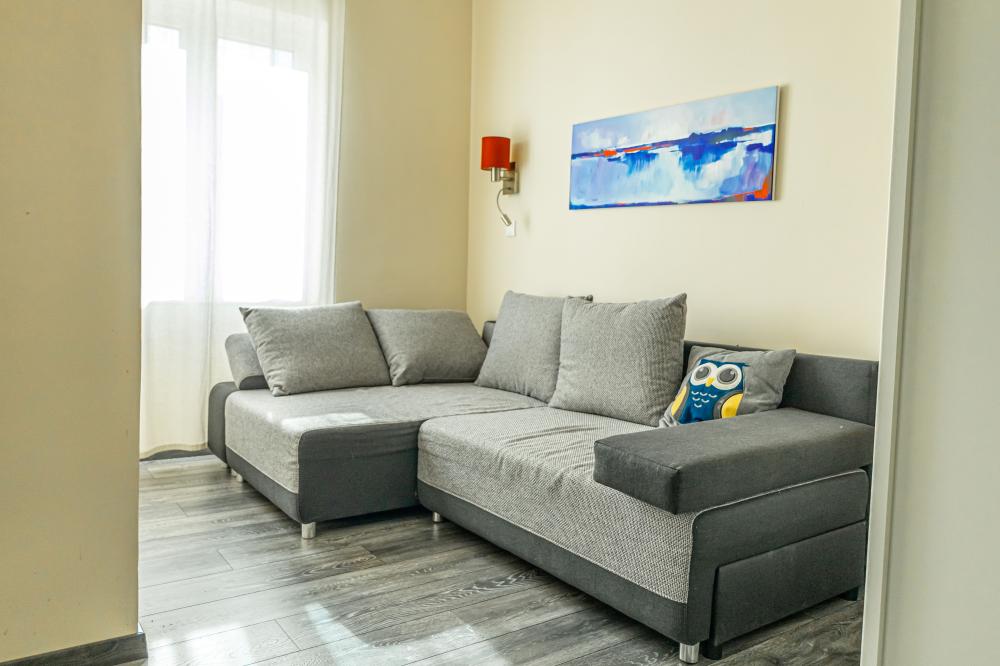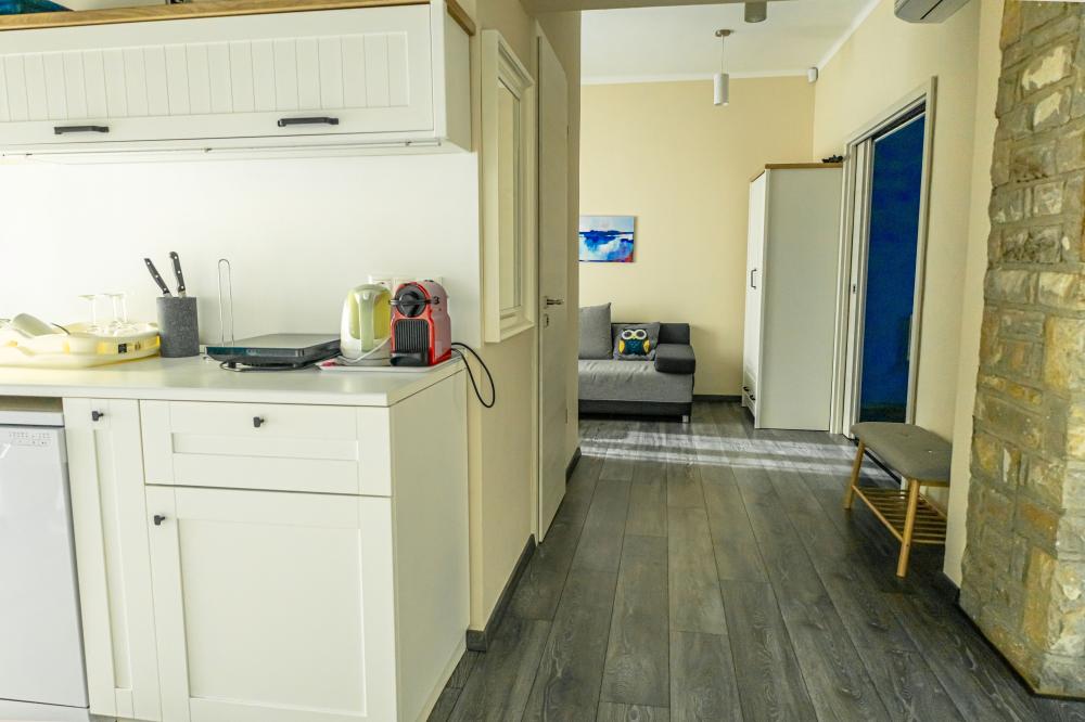 Az apartman 41nm-es, a végig üvegfalú konyhából külön bejáratú, nagy méretű hálószoba nyílik, míg a nappali sarokban kihúzható kanapéágy van. A konyhában mosogatógép, főzőlap, mikró, kenyérpirító, teafőző, vízforraló Nespresso kávégép található.
