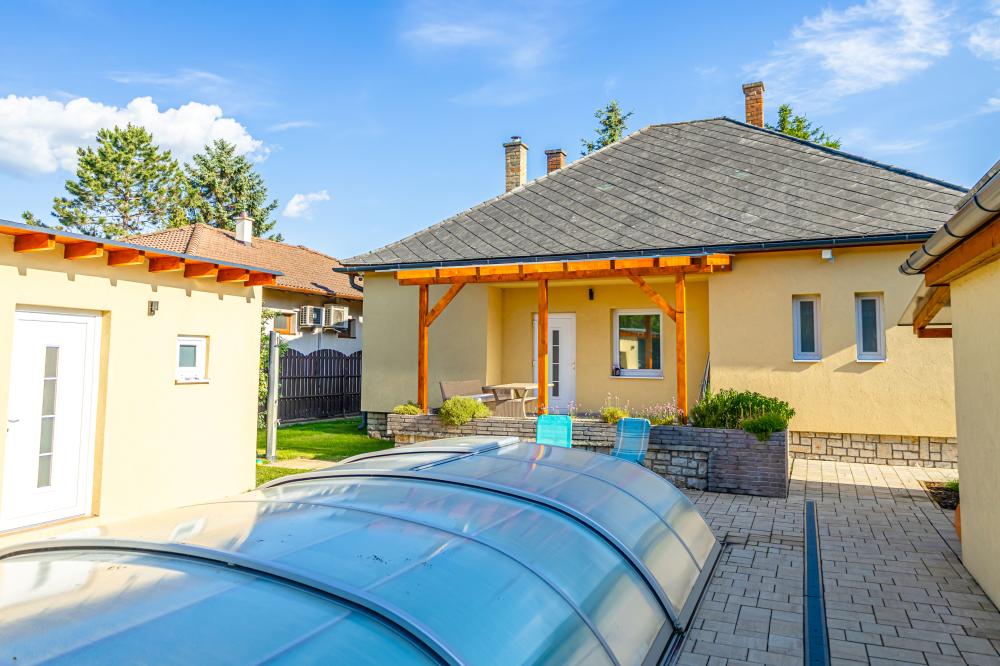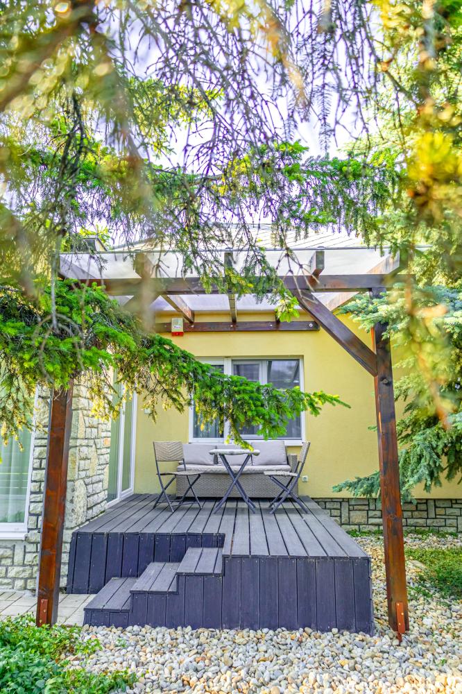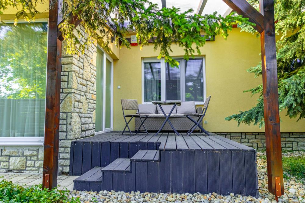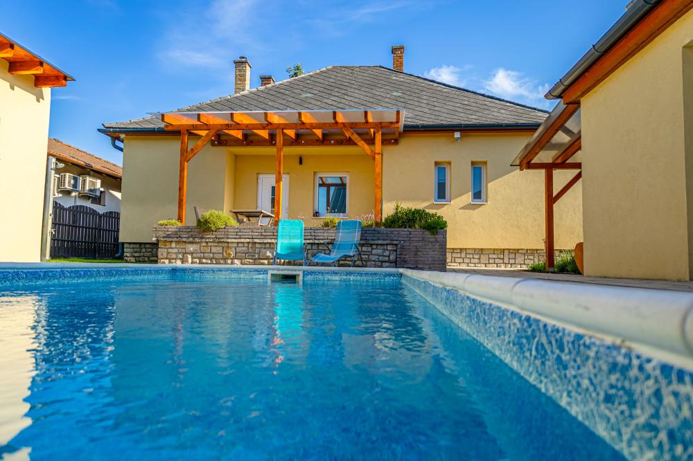 A pihenést medence és kerti terasz is szolgálja. Strand 6-8 perc séta.