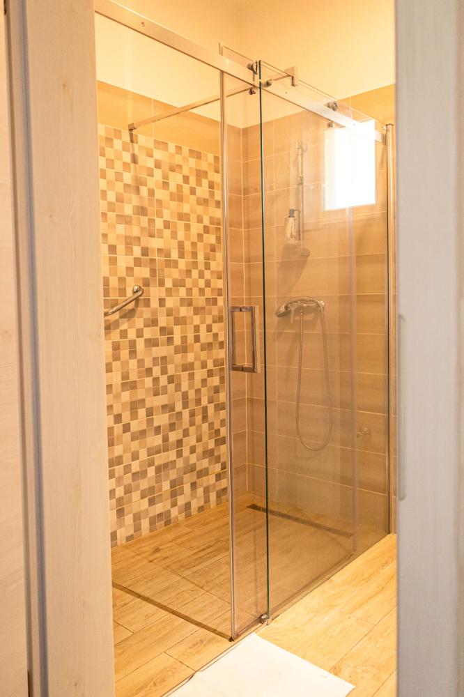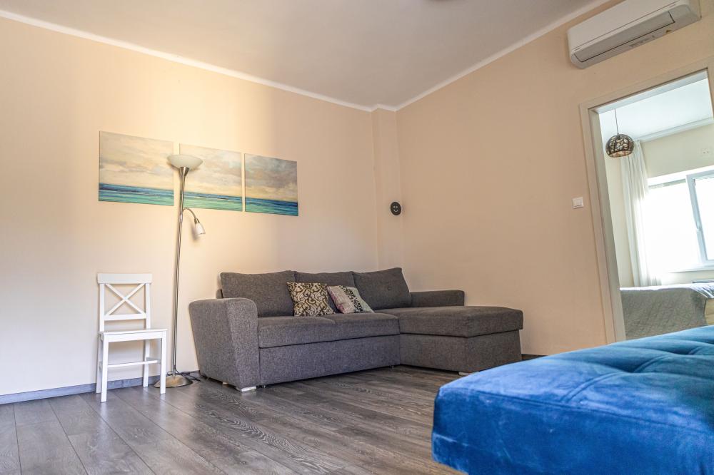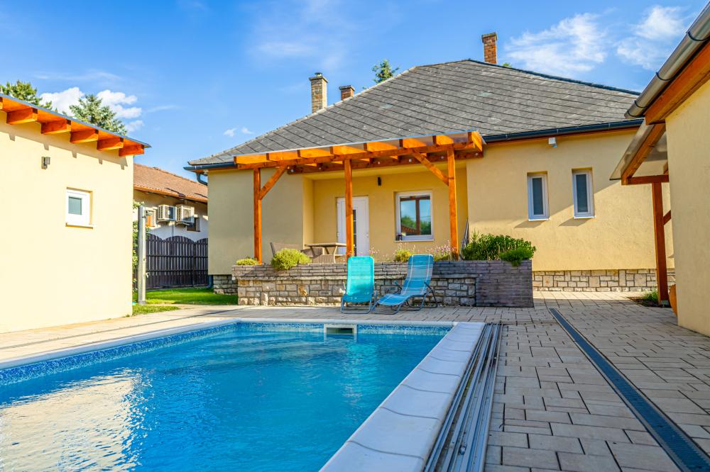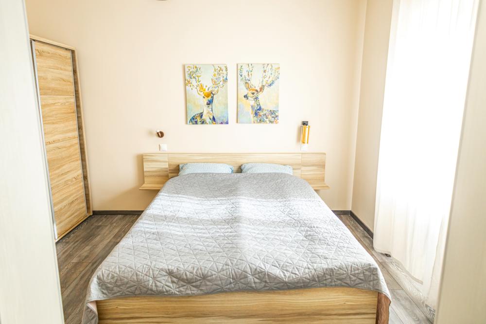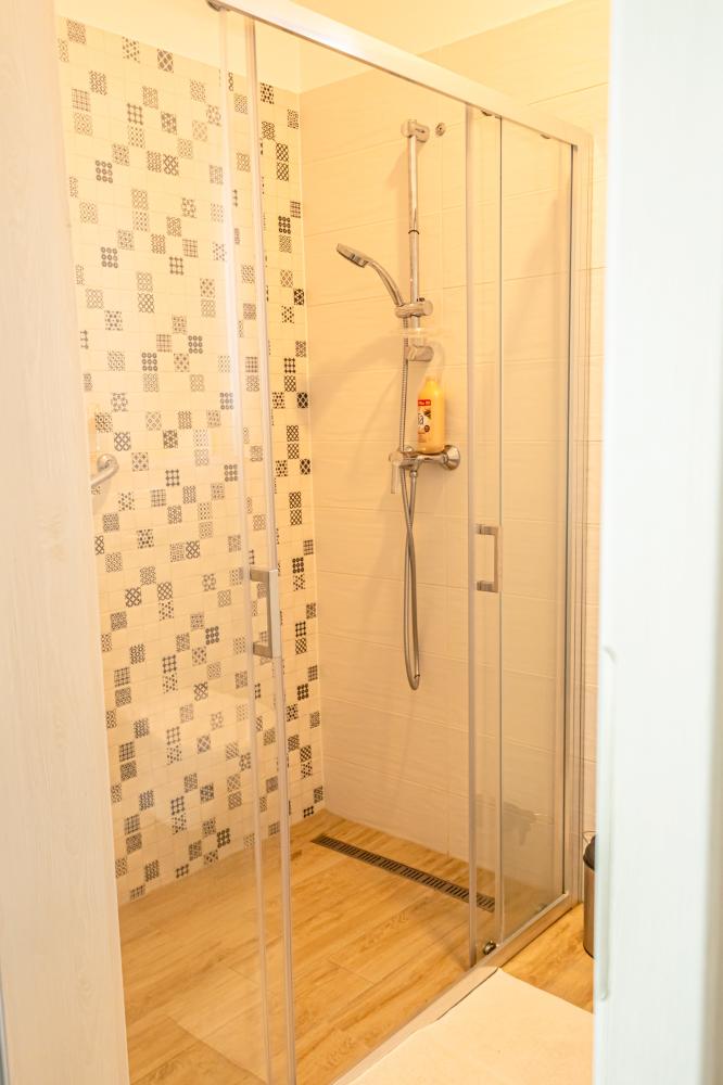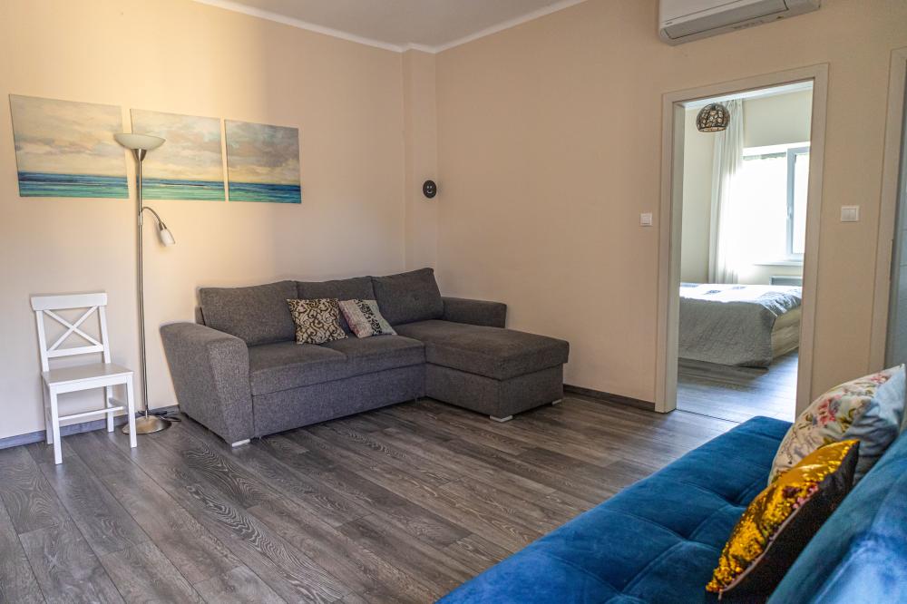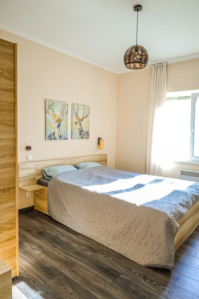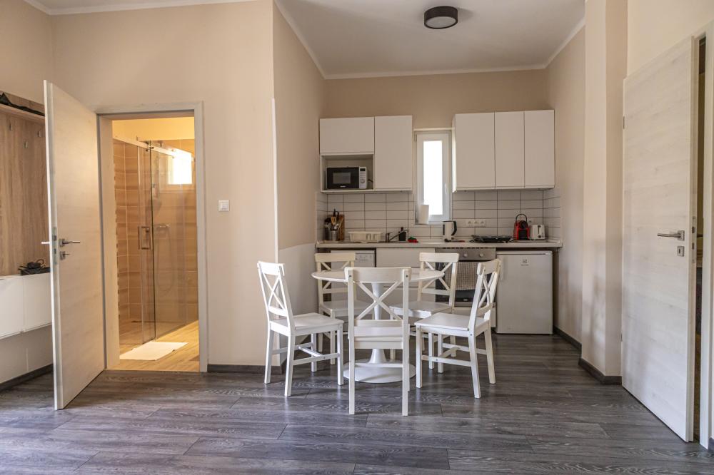 Legnagyobb apartmanunk 65 nm, a medencével szemben helyezkedik el, nagy terasszal. A nappali-konyhából 2 külön bejáratú hálószoba nyílik, az egyik hálónak saját fürdőszobája van. Ezen felül még egy teljes zuhanyzós fürdő és egy vendég wc is az apartman része. A hálókban franciaágy szolgálja a pihenést, a nappaliban 2 kihúzható kanapéágy van. Kisgyermek részére az egyik hálóban pótágyazás is megoldható. Kényelmesen 2 pár, egy nagyobb család, vagy akár két kisgyermekes családnak is.